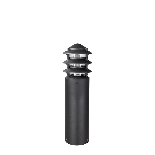 For the illumination of pathways and low level horizontal lighting, this low voltage tiered bollard fixture is constructed of die-cast, copper-free, aluminum and heavy gauge extruded aluminum. A super durable polyester powder-coat finish is applied and available in 18 colors. A prismatic, high-impact, polycarbonate lens safeguards the lamp and optics. Mounting hardware is included.