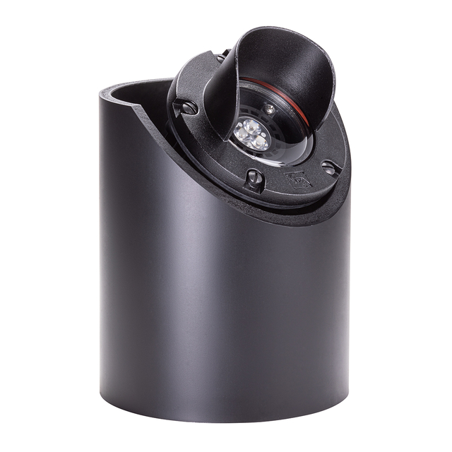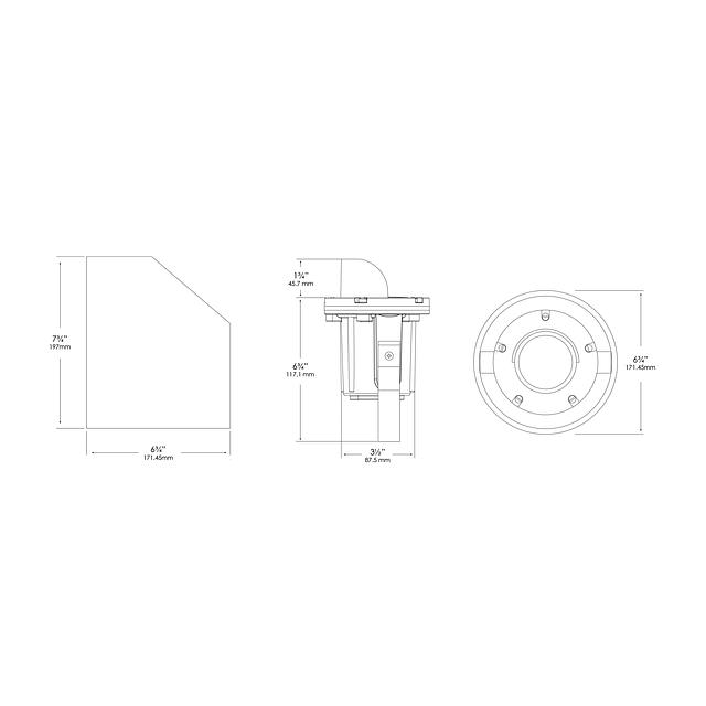 Highly controllable, this rugged low voltage well light fixture with glare shield is constructed of die-cast, copper-free aluminum suspended inside a 6¾” diameter black ABS well. The lens is clear, high temperature tempered soda-lime glass for high-impact resistance, furnished with a silicone molded gasket for a watertight seal. An adjustable housing bracket provides ±45° of tilt within the well for precise beam control and locks into place preventing any disruption of lamp position during maintenance. Also, an adjustable lamp bracket provides an additional ±25° of tilt.