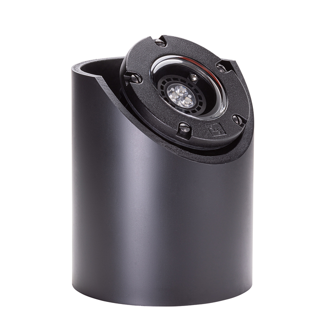 Highly controllable, this rugged low voltage well light fixture is constructed of die-cast, copper-free aluminum suspended inside a 6¾” diameter black ABS well. The lens is clear, high temperature tempered soda-lime glass for high-impact resistance, furnished with a silicone molded gasket for a watertight seal. An adjustable housing bracket provides ±45° of tilt within the well for precise beam control and locks into place preventing any disruption of lamp position during maintenance. Also, an adjustable lamp bracket provides an additional ±25° of tilt.