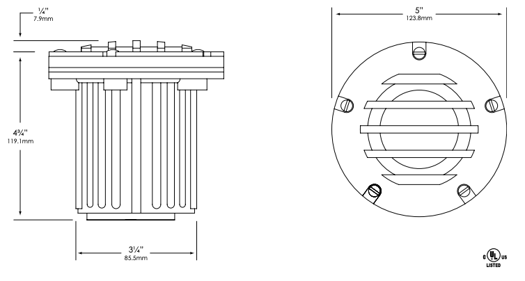 This ruggedly designed low voltage in-ground fixture with a solid brass directional grate cover is constructed of injection-molded, fiber-reinforced composite for strength and high UV stability and is warranted for ten years against corrosion. The convex lens is clear, high temperature tempered soda-lime glass for high-impact resistance, furnished with silicone molded gasket for a watertight seal. Also, an adjustable lamp bracket (not available with integrated LED) provides ±25° of tilt for precise beam control and locks into place preventing any disruption of lamp position during maintenance.