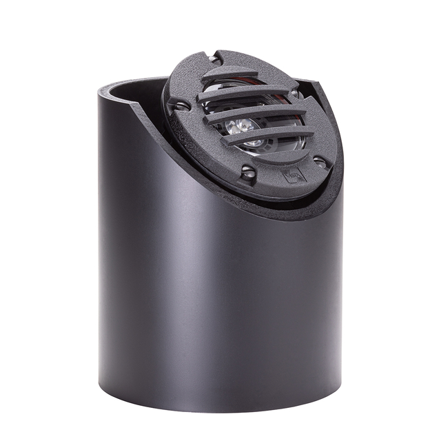 Highly controllable, this rugged low voltage well light fixture with directional grate cover is constructed of injection-molded, fiber-reinforced composite suspended inside a 6¾” diameter black ABS well. The convex lens is clear, high temperature tempered soda-lime glass for high-impact resistance, furnished with a silicone molded gasket for a watertight seal. An adjustable housing bracket provides ±45° of tilt within the well for precise beam control and locks into place preventing any disruption of lamp position during maintenance.