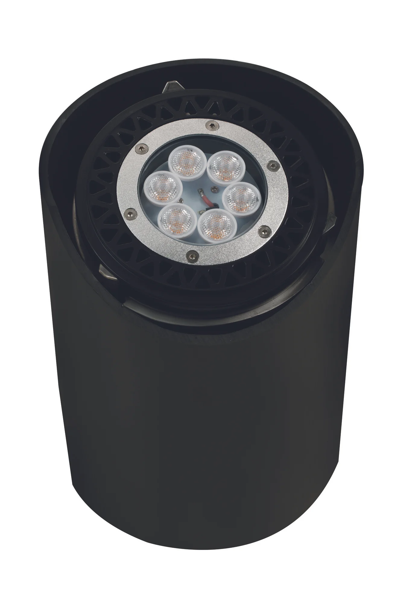 Adjustable 316 Marine Grade Stainless Steel PAR36 Well Light with a Black finish, housed in a reversible (flat and angle cut) PVC sleeve.