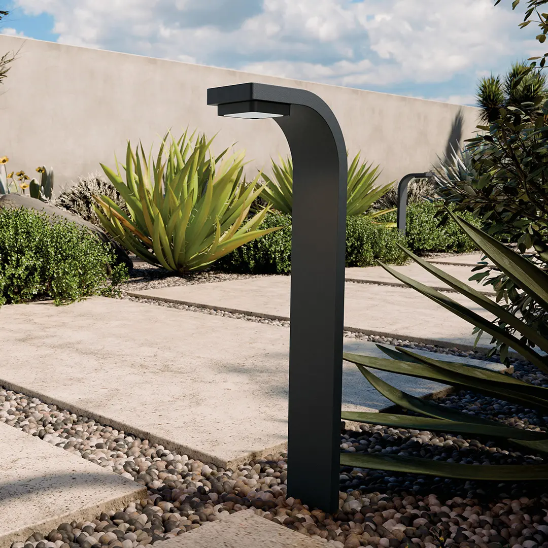 Its contemporary design blends seamlessly with nature while spotlighting the surrounding exterior style