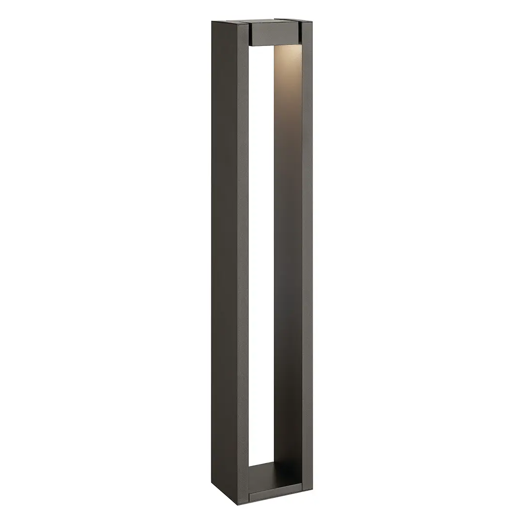 Illuminate outdoor spaces with the 12 Volt LED 25.4" Aimed Bollard in Textured Black. This stylish path light offers a 2700K integrated LED light source, delivering a warm white light to a path or walkway. The innovative design allows the linear, cube-shaped top to tilt up to 45 degrees forward or backward, giving you precise control over where the light shines. Crafted to withstand the elements, the light's electrical components are fully sealed under a polycarbonate lens and its solid aluminum construction offers a robust stake-to-stem connection. The clean, modern lines of this bollard light effortlessly complement a wide range of exterior styles, making it a versatile addition to any outdoor setting.