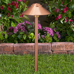 For accenting low flower beds or illuminating pathways, this low voltage path light fixture is constructed of spun, solid copper. Vista’s Turn-To-Lock solid brass lamp base makes lamp maintenance simple and tool-free. The stem is a ½” heavy-gauge, extruded, solid copper pipe with a ½” NPT. A wave shaped, textured "Panoramic Plus" Tuffak® lens maximizes light transmittance while safeguarding the lamp and optics. Mounting hardware is included – choice of ABS ground stake or mounting canopy.