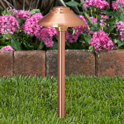 For accenting low flower beds or illuminating pathways, this low voltage path light fixture is constructed of spun, solid copper. Vista’s Turn-To-Lock solid brass lamp base makes lamp maintenance simple and tool-free. The stem is a ½” heavy-gauge, extruded, solid copper pipe with a ½” NPT. A wave shaped, textured "Panoramic Plus" Tuffak® lens maximizes light transmittance while safeguarding the lamp and optics. Mounting hardware is included – choice of ABS ground stake or mounting canopy.