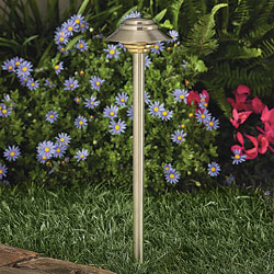 For accenting low flower beds or illuminating pathways, this low voltage path light fixture is constructed of spun, stainless steel. Vista’s Turn-To-Lock solid brass lamp base makes lamp maintenance simple and tool-free. The stem is a ½” heavy-gauge, stainless steel pipe with a ½” NPT. A wave shaped, textured "Panoramic Plus" Tuffak® lens maximizes light transmittance while safeguarding the lamp and optics. Mounting hardware is included – choice of ABS ground stake or mounting canopy.