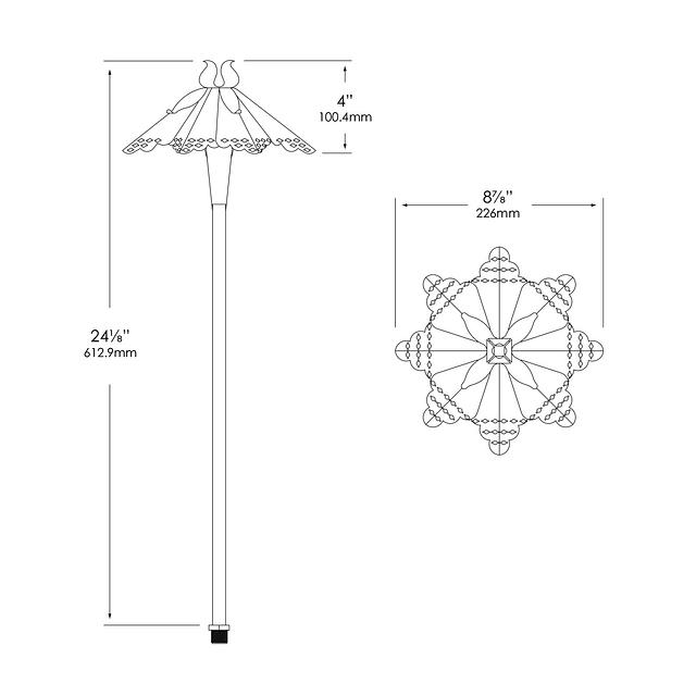 This elegantly designed low voltage path light fixture is constructed of die-cast, copper-free aluminum for strength and reliability. The stem is a ¼” schedule-40 aluminum pipe with a ½” NPT custom bushing designed with a stress-dispersing collar to ensure strength and stability for mounting. A super durable polyester powder-coated finish is applied and available in 18 colors. A clear, high impact, polycarbonate lens safeguards the lamp and optics. Mounting hardware is included – choice of ABS ground stake or mounting canopy.