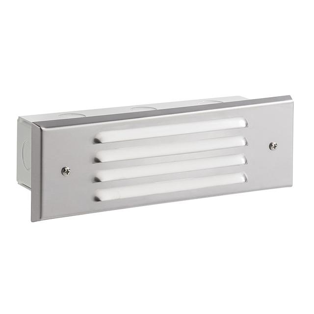 Recessed within the elements of steps or walls for low-level area lighting, this low voltage louvered face brick light fixture is constructed of a stamped and formed, copper-free, aluminum housing with ½” knockouts on the back and sides. A stamped solid copper cover plate is fitted with UV-resistant weather stripping to ensure a superior weather-tight seal. A translucent, high-impact, polycarbonate lens safeguards the lamp and optics.