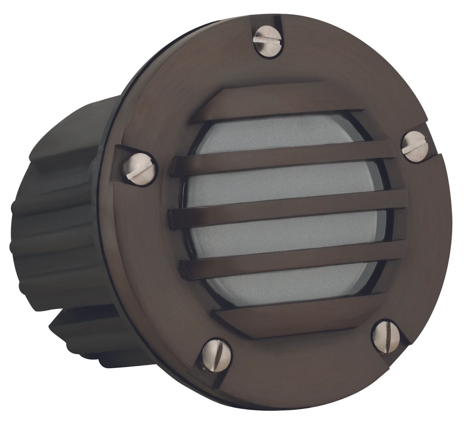 Step Light with a Brass Louvered Faceplate and Frosted Lens, housed in an Injection-molded Composite Base Finished in Antique Bronze or Gun Metal.