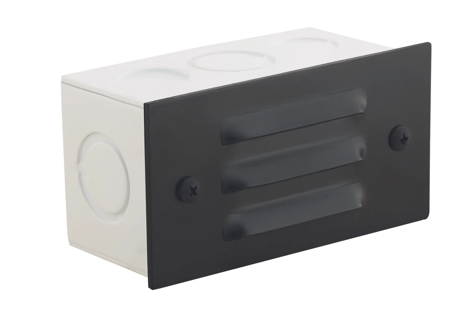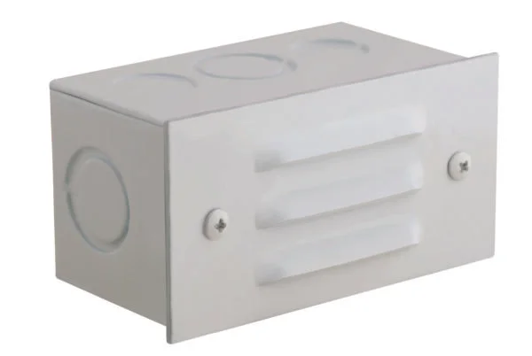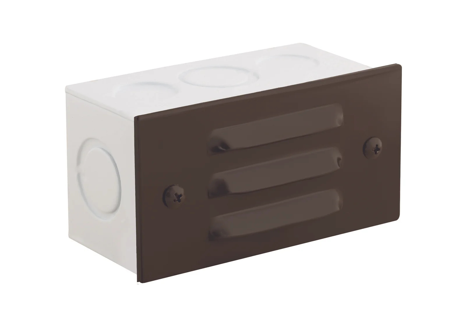 Aluminum 3-louver Step Light, with a white powder coated steel mount box. Finished in Black, Bronze, Rust, or White.