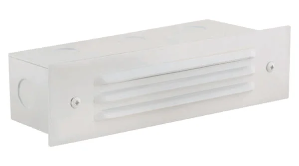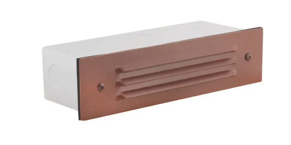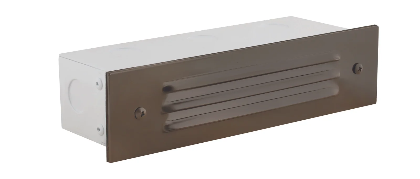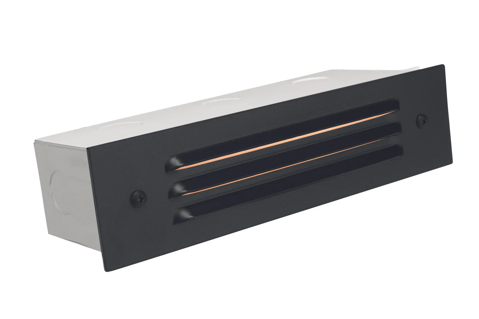 Stamped aluminum 3-Louver Brick Light with a self-levelling heavy duty steel mount box. Faceplate finished in Black, Bronze, Rust, or White.